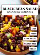 Like all of my other bean salads, this recipe is great to keep in the fridge on busy weeks. This salad is perfect for parties, too. It’s a healthy side dish on its own. You can also serve it as black bean salsa with tortilla chips.
